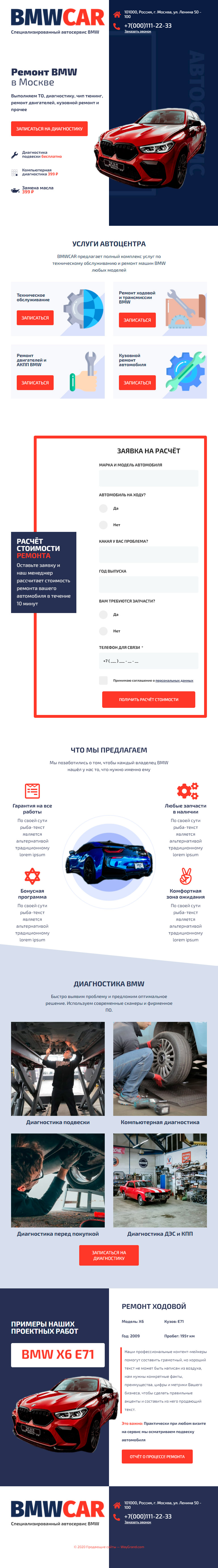 Закажите готовый продающий сайт лендинг #0210202 в Обнинске за 1-3 дня «под ключ» по выгодным ценам на WayGrand: свёрстан, отрисован и готов к рекламе. Тематика шаблона «Ремонт BMW».